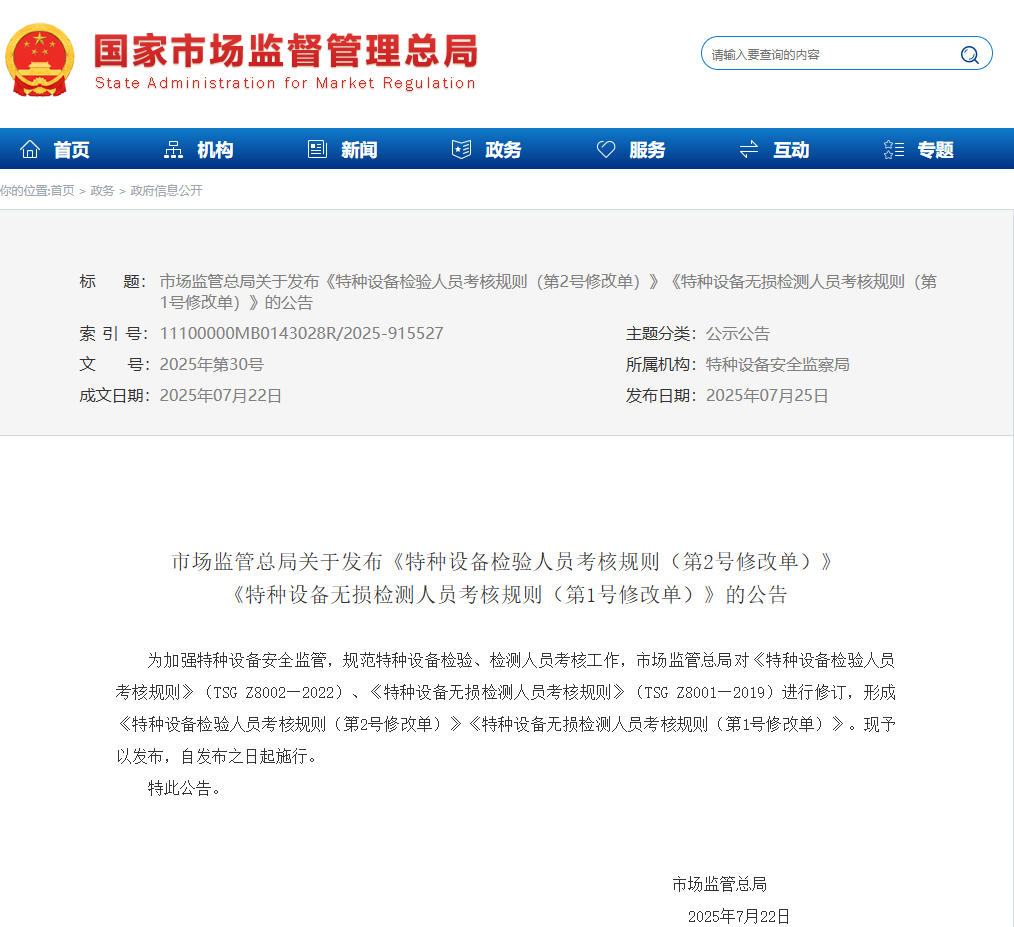 《特種設(shè)備無損檢測(cè)人員考核規(guī)則(第1號(hào)修改單)》(TSG Z8001—2019)